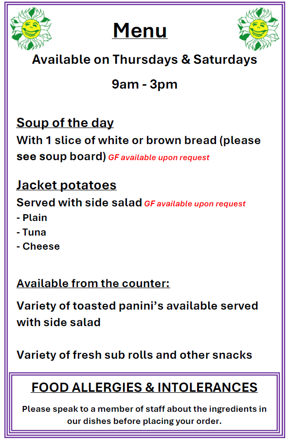 In addition to our limited home baked goods we also serve hot drinks. We also stock cookies, biscuits, pastries, pasties, quiche, scones, scotch eggs, pork pies, crisps and plenty of classic light snacks for people making a quick bite and hot drink on their visit.