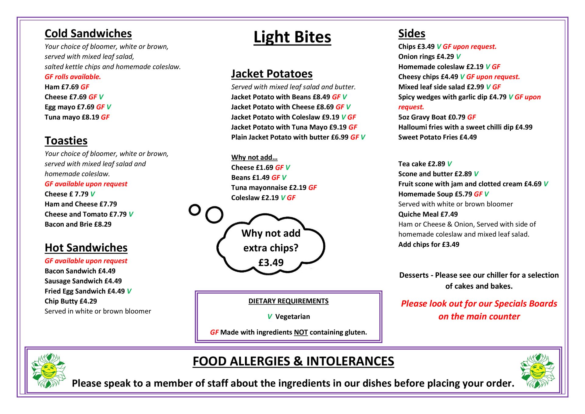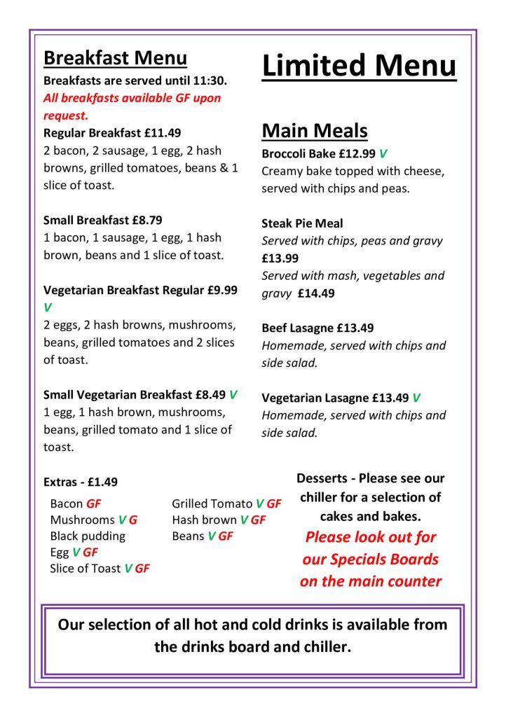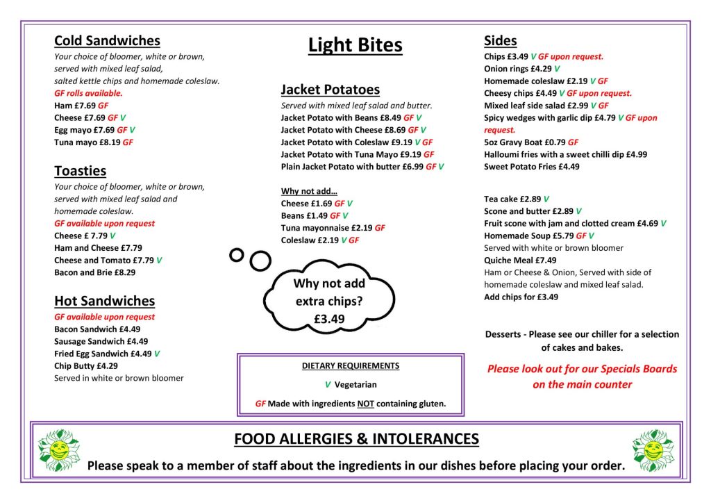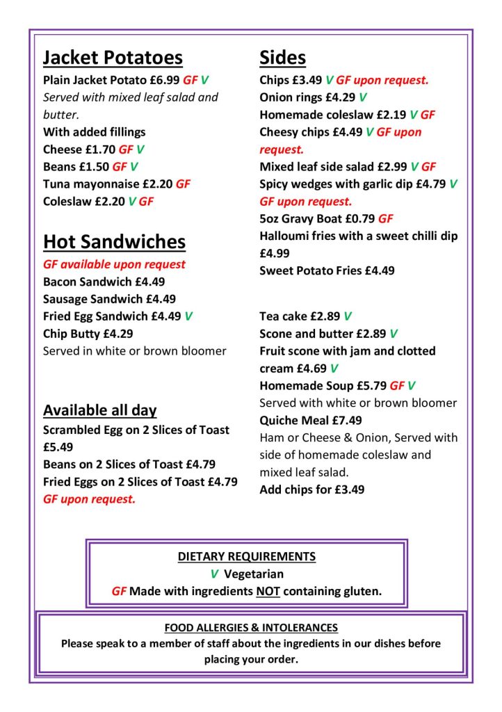 Thursday and Saturday we have limited hot food options of Jacket potatoes, Soup of the day and fresh paninis served daily.