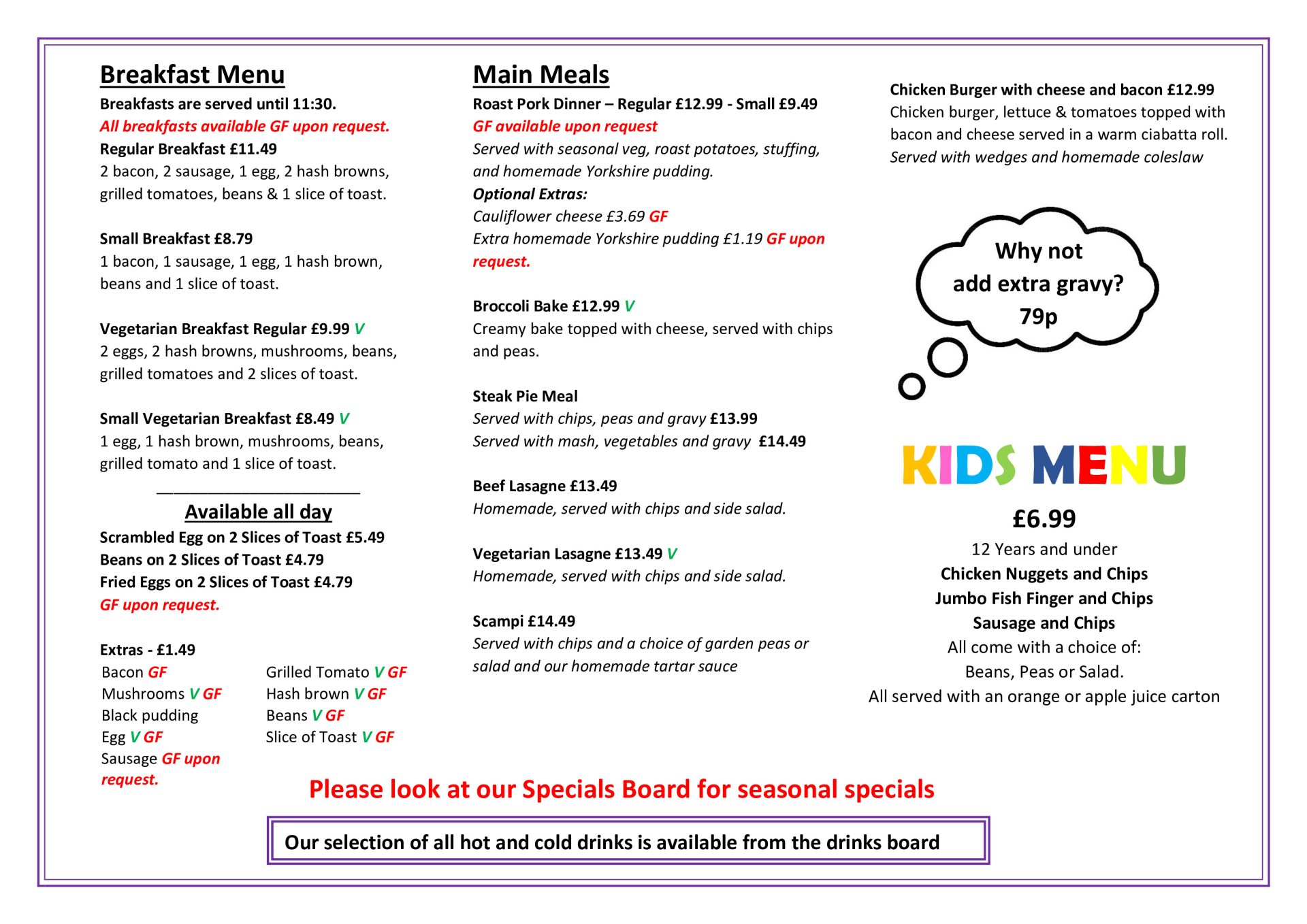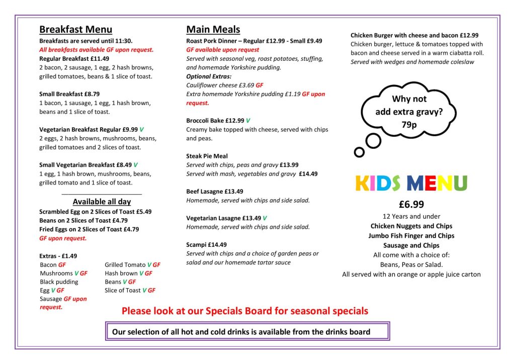 Our specials board changes regularly offering refreshing limited alternatives to our traditional favourites such as vegetarian curries, pulled pork sweet potato fries, loaded baguettes and more.